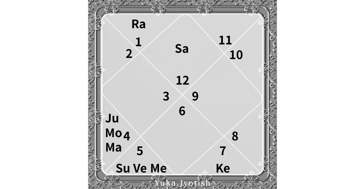 ついでながら、金星と太陽が6室に一緒にあったり、8室にケートゥがあったりと、夫婦関係も良好ではないだろう、と読むことができます。